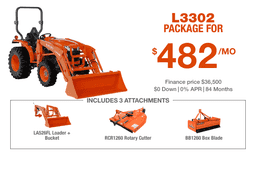 $0 Down, 0% A.P.R. financing for up to 84 months on purchases of select new Kubota L3302HST equipment from